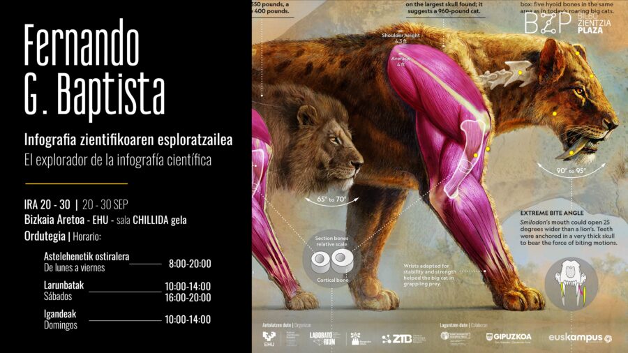 La exposición Fernando G. Baptista. El explorador de la infografía científica llega a Bilbao para mostrar el trabajo de uno de los ilustradores científicos más reconocidos a nivel mundial, Fernando G. Baptista, licenciado en Bellas Artes por la EHU y editor senior de infografía en la prestigiosa National Geographic Magazine.