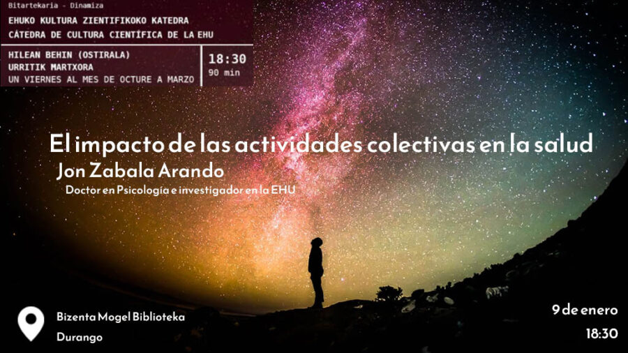 Para reflexionar sobre esta cuestión, el investigador Jon Zabala, doctor en Psicología y profesor en la Facultad de Educación de Bilbao, ofrecerá la charla “Ekimen kolektiboen eragina osasunean (El impacto de las actividades colectivas en la salud)”.