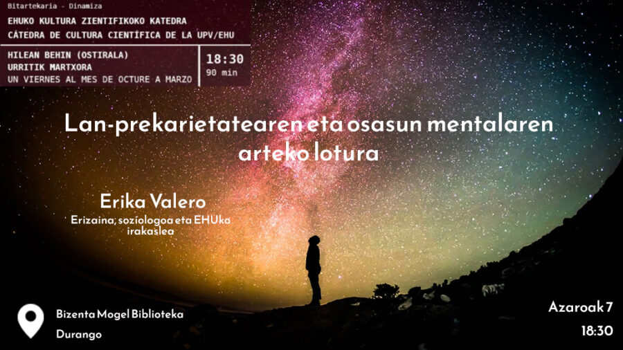 Gai honetan sakontzeko, Erika Valero erizain, soziologo eta EHUko irakasleak “La relación entre la precariedad laboral y la salud mental” (“Lan-prekarietatearen eta osasun mentalaren arteko lotura”) izenburupeko hitzaldia emango du. Euskal testuinguruko hainbat datu abiapuntu hartuta, Valerok lan-prekarietatea zer den azalduko du eta prekarietate horren dimentsio ezberdinek nola eragin dezaketen, modu nabarmenean, osasun mentalean.